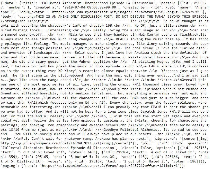 response = requests.get(f"https://api.myanimelist.net/v2/forum/topic/{ids}?limit=100", headers=headers)